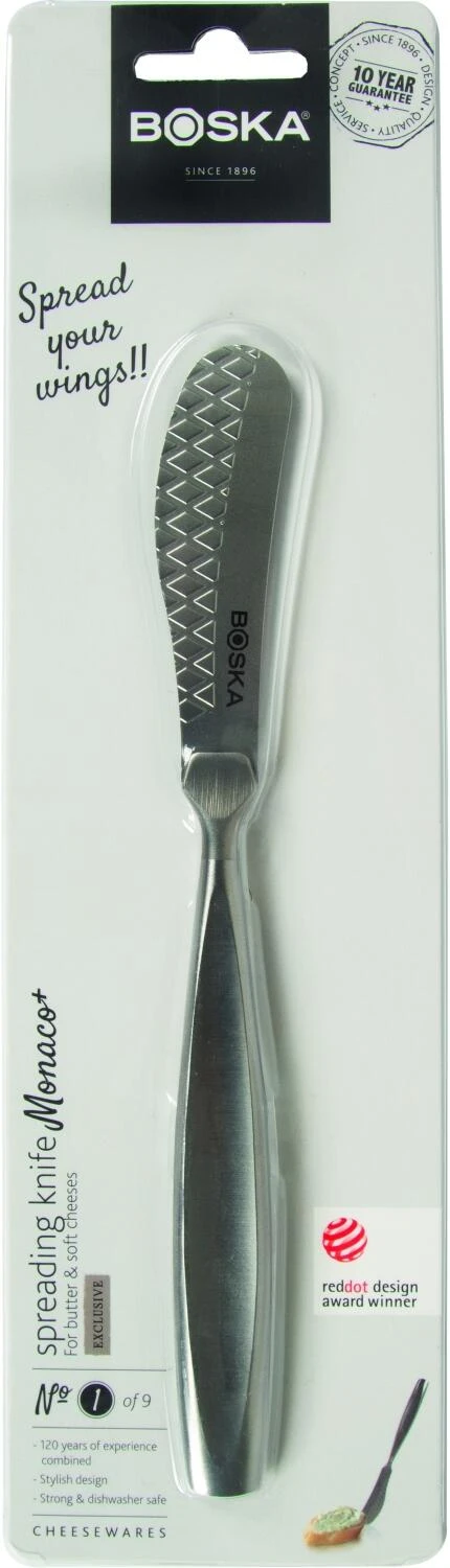 Käsemessers Monaco+ ist flach, und das sorgt für zusätzlichen Halt. Dadurch, dass das Streichmesser vollständig aus Edelstahl besteht, ist es spülmaschinenfest, sodass es schnell wieder sauber und bereit für seinen nächsten Einsatz ist.