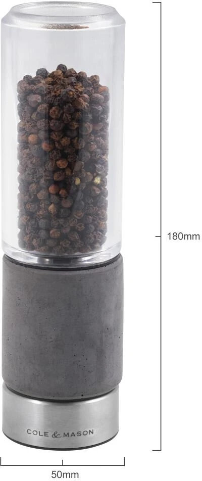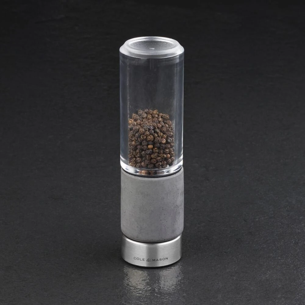 Eine stilvolle und zeitgemässe Pfeffermühle, die von der urbanen britischen Architektur inspiriert wurde. Hergestellt aus kristallklarem Acryl und Beton. Die klare Acrylplatte bildet einen guten Kontrast zur glatten, dunkelgrauen Betonbasis. Die Einfachheit und der Minimalismus der Form lassen die Eigenschaften der Materialien hervorstechen. Der Beton wurde mit einer Schicht Klarlack versehen, um seine Oberfläche zu schützen. Der Boden verfügt ausserdem über einen Schutzring aus Kunststoff, der verhindert, dass der Beton mit Arbeitsflächen in Kontakt kommt, um Kratzer oder Beschädigungen zu vermeiden. Ausgestattet mit dem Cole & Mason Precision+ Karbonstahlmahlwerk, das Pfefferkörner schält, anstatt sie zu zerdrücken, um eine maximale Geschmacksfreisetzung aus jedem Dreh zu gewährleisten. Die Mühle ist mit hochwertigen schwarzen Pfefferkörnern aus Vietnam gefüllt und kann ab dem Moment, in dem Sie sie erhalten, verwendet werden. Um den Mahlgrad von fein auf grob einzustellen, ziehen Sie einfach den Knopf am Boden der Mühle fest oder lösen Sie ihn. Verwenden Sie eine grobe Einstellung für Steaks oder Tomatensalat, eine mittlere Einstellung für Pizza und eine feine Einstellung für Suppen und Saucen. Nachdem Sie die gewünschte Mahlgradgrösse ausgewählt haben, halten Sie die Mühle fest am Betonabschnitt und drehen Sie am Edelstahlring.