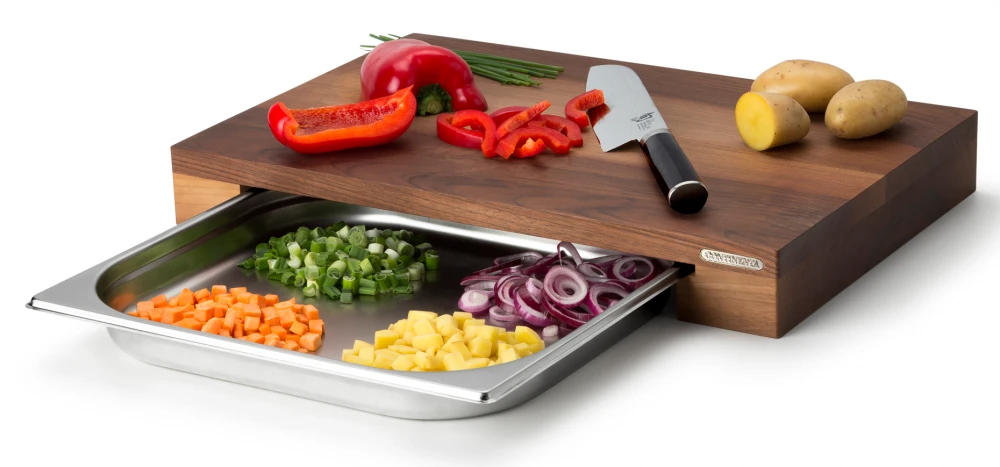 Continenta Schneidebrett aus Walnuss mit Schublade. Mit praktischer Edelstahl-Schublade zum Auffangen des Schneidguts.