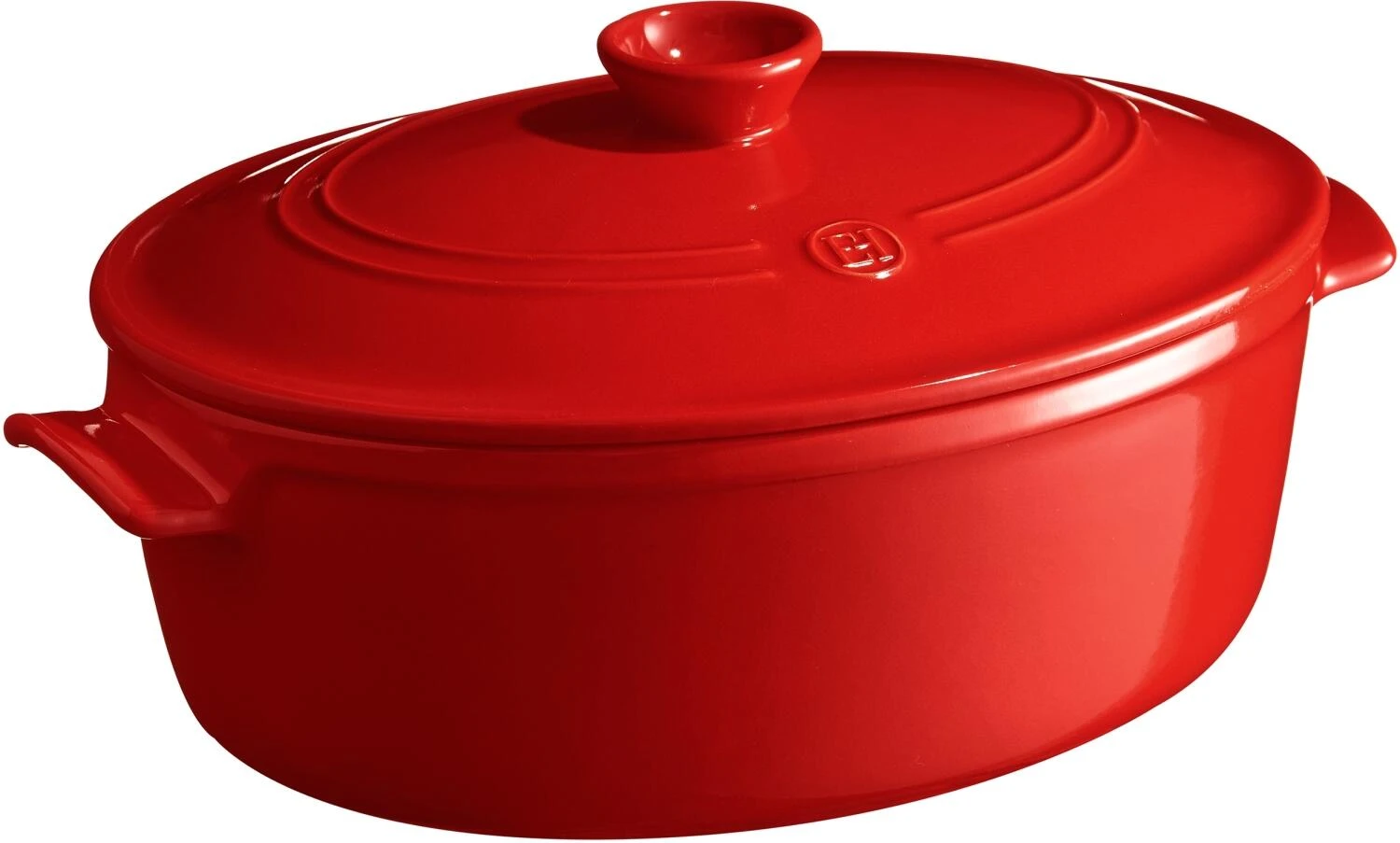 Emile Henry Schmortopf oval aus Flame®-Keramik in granatapfel. Der ideale Topf zum sanften Schmoren und Braten, auf der Herdplatte oder im Ofen zum Braten oder Gratinieren, mit oder ohne Deckel – und sogar auf dem Gartengrill.