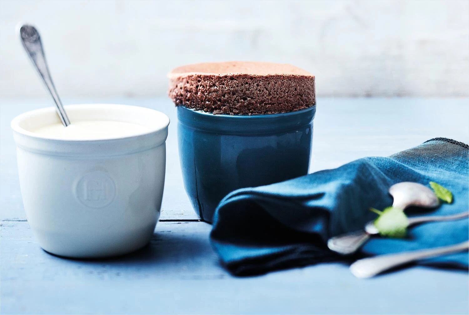 Emile Henry Töpfchen Nr. 8 in feu doux. Besonders hoch für die Zubereitung für Soufflés, Panna Cotta oder Muffins.