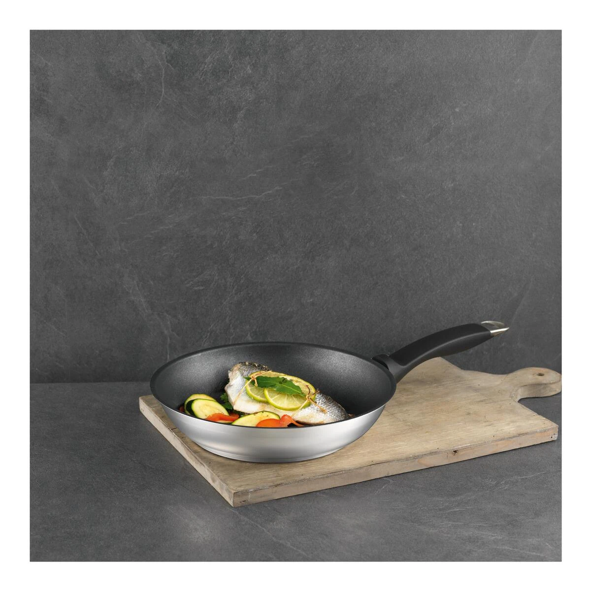 Kuhn Rikon Bratpfanne Silver Star, beschichtet. Die in der Schweiz hergestellte, beschichtete Edelstahl Bratpfanne (Inox 18/10) eignet sich ideal für schonendes Anbraten von Gemüse, Fleisch (Rind, Schwein, Kalb, Huhn, Geschnetzeltes, Gehacktes), Eierspeisen und Kartoffeln aller Art und in jeder Küche.