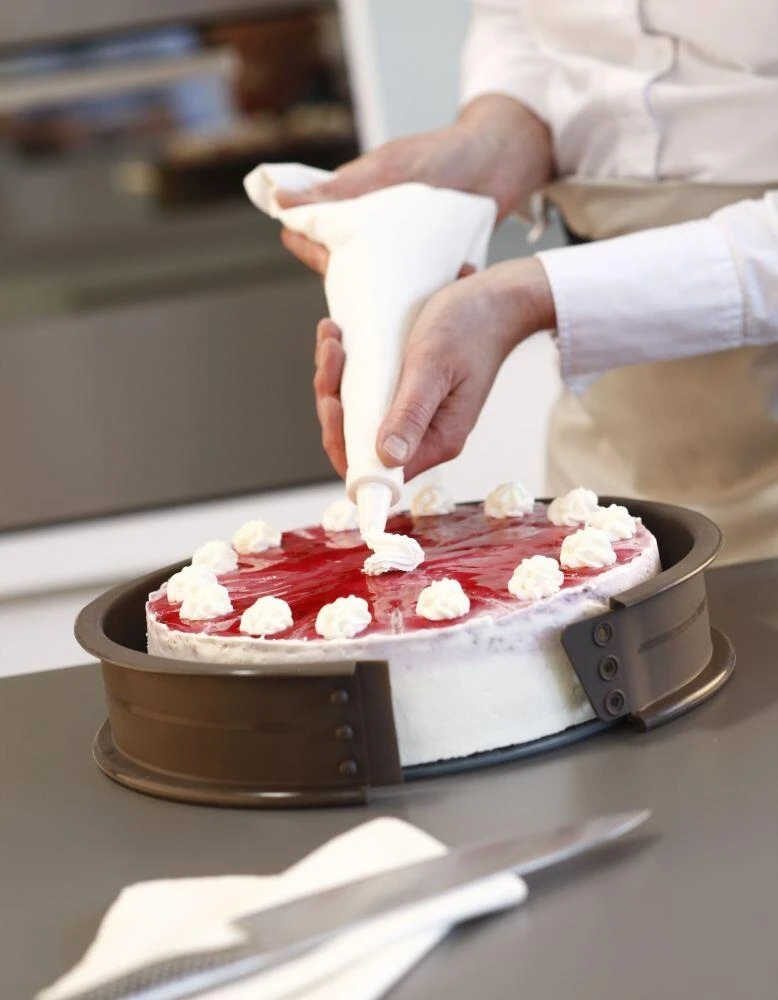 Die Kuchenplatte der Lurch FlexiForm Springform ist ein hochwertiger Glasboden und der Kuchenring ist aus flexiblem, stabilem Platin-Silikon hergestellt. Vor dem Backen wird der Silikonring einfach über die Druckknöpfe geschlossen, sodass er dicht mit dem Glasboden abschließt. Nach dem Backen kann der Silikonring ganz einfach geöffnet und vom Kuchen abgenommen werden.