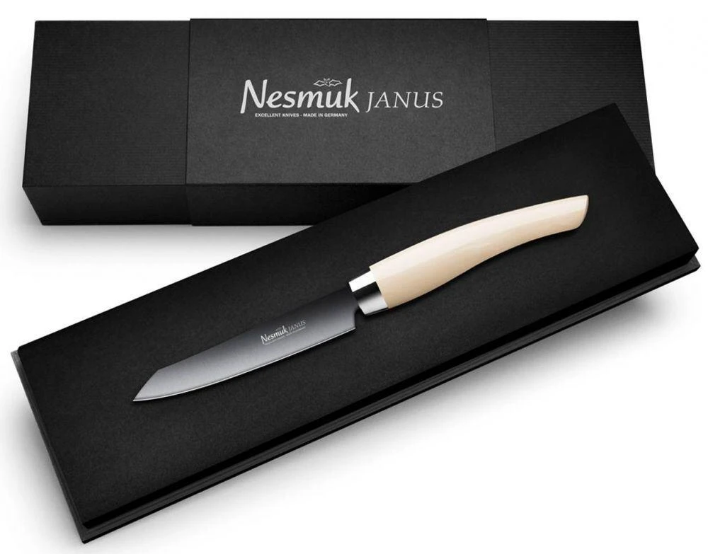 Dieses Officemesser aus der Serie Janus verbindet das handwerkliche Können und die langjährigen Erfahrungen von Nesmuk mit modernsten Materialien und Fertigungsmethoden. Die hochwertige DLC-Beschichtung zeichnet sich durch enorme Härte (2.300 Vickers), niedrige Reibwerte und hohe Haftfestigkeit aus. Die Klinge aus rostbeständigem Hochleistungsstahl mit Niobanteil und Klingenhärte von 60 HRC, der im Klingenstahl trotz Rostfreiheit, Säure- und Kratzunempfindlichkeit für ein sehr feines Gefüge sorgt, ermöglicht eine lange Schneidhaltigkeit. Die massive Messerzwinge aus gebürstetem matten Edelstahl und der formschönen Griffe aus Edelholz unterstreichen die handwerkliche Qualität. Die kurze Klinge des Officemesser Janus von Nesmuk ist perfekt zur Vor- und Zubereitung, Putzen oder zum Schälen von z.B. Obst und Gemüse geeignet. Geliefert wird das Messer in einer hochwertigen mattschwarzen Schatulle und ist die perfekte Wahl für Vor- und Zubereitungsarbeiten.