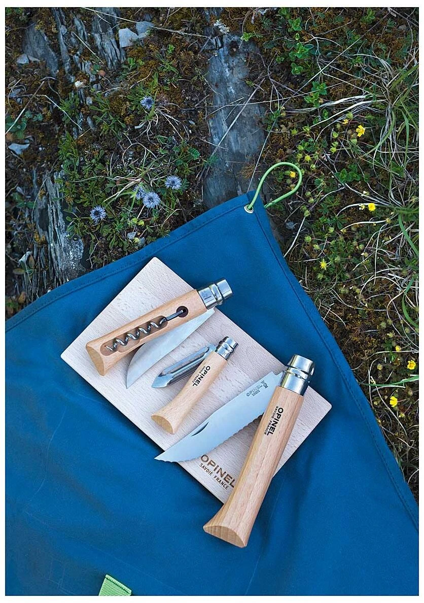 Wenn es um die Brotzeit beim Wandern, die Campingküchen-Basisausrüstung oder das Picknick im Park geht, immer wieder stellt sich die Frage: Was nehme ich am besten mit? Ein Messer? Ein Schneidebrett? Einen Korkenzieher? Opinel hat mit diesem Set alle Fragen beantwortet: Es ist das essentielle Set, das man für eine Essenspause mitnehmen sollte! Es besteht aus drei ausgewählten Produkten: ein Opinel No. 12 mit dem bei den Küchenmessern bewährten Wellenschliff als großes Allroundmesser, ein Opinel No. 10 mit glatter Klinge und integriertem Korkenzieher sowie ein robustes, klappbares Opinel No. 6 Schälmesser. Alle Produkte sind mit einem Griff aus europäischer Buche versehen und die Klingen der Messer verwenden rostfreien Sandvik-12C27-Edelstahl. Passend dazu ist das 20 x 12 Zentimeter große Buchenholzbrett mit abgerundeten Kanten Teil des Sets.