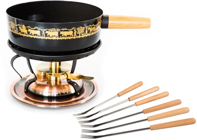 Freuen Sie sich auf einen Fondueabend mit zartgeschmolzenem Käse im Kreise Ihrer Lieben – bis zu sechs Personen genießen mit der Käsefonduegarnitur Alpaufzug Emotion, Kupfer brüniert von