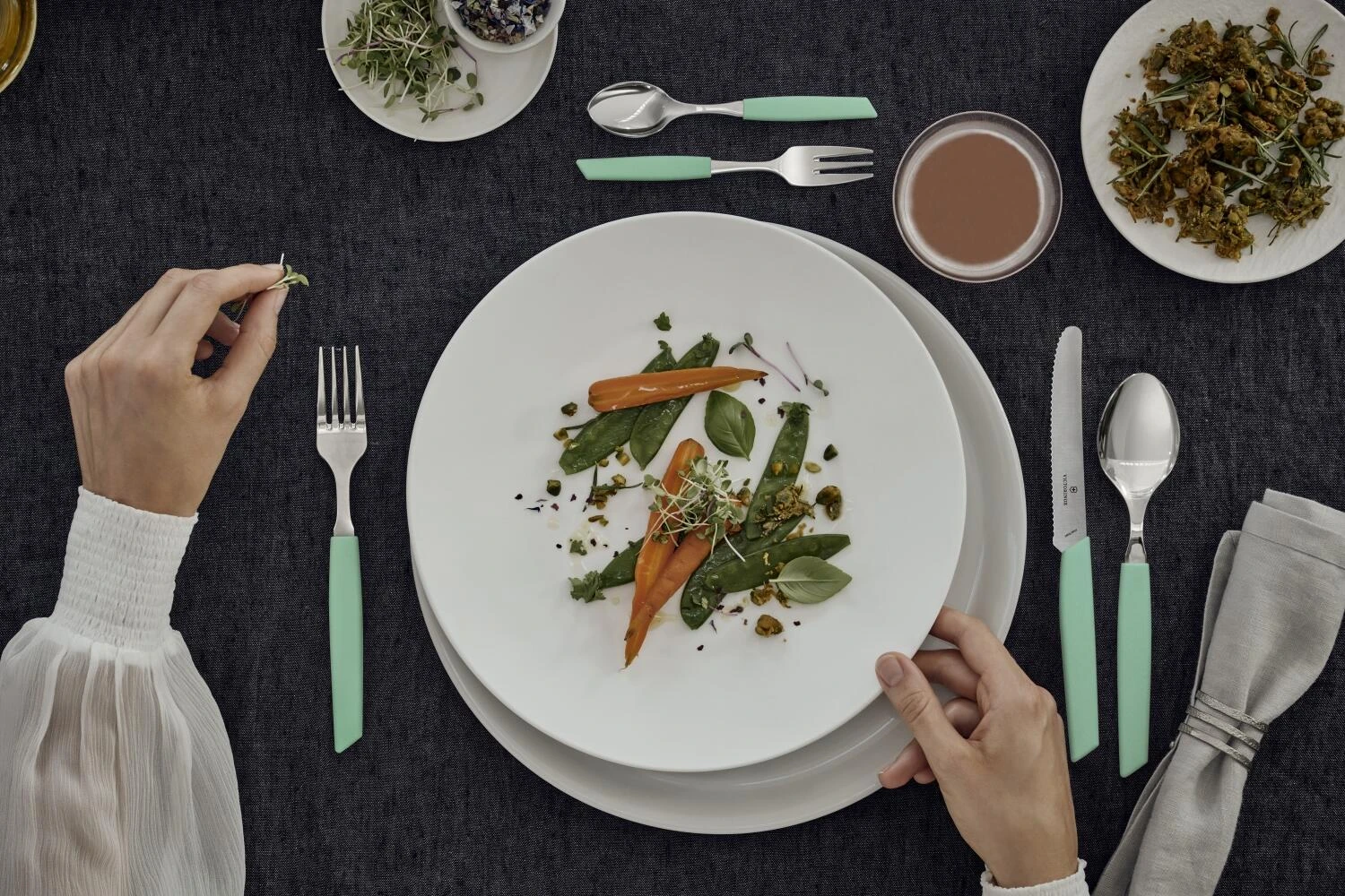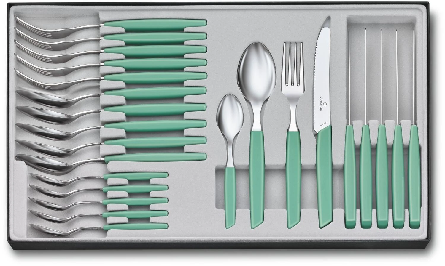 Victorinox Swiss Modern Besteck-Set mit Tomatenmessern, 24-teilig, minzgrün. Modernes Besteck für den alltäglichen und besonderen Gebrauch.