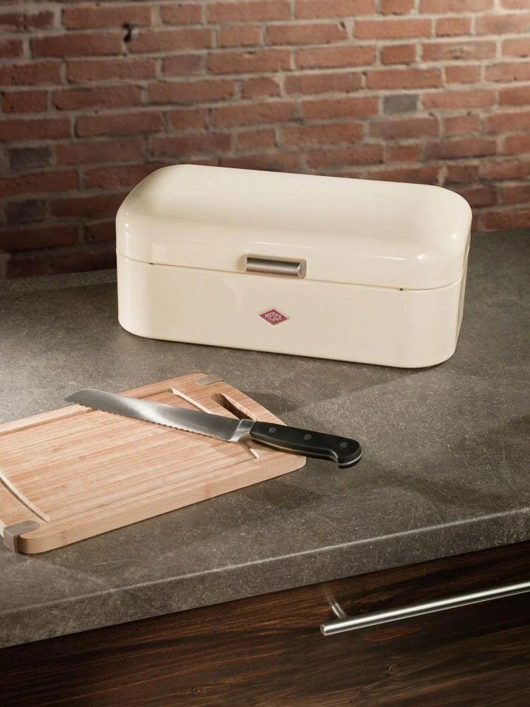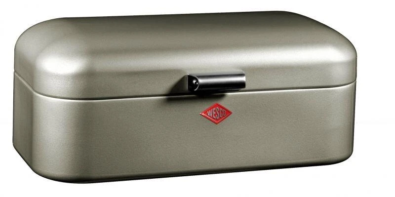 Wesco Brotkasten Grandy in neusilber. Grandy ist ein Retro-Klassiker im Stil der 40er Jahre. Ideal zur Aufbewahrung von Brot, Gebäck, Kuchen oder was immer Sie möchten.