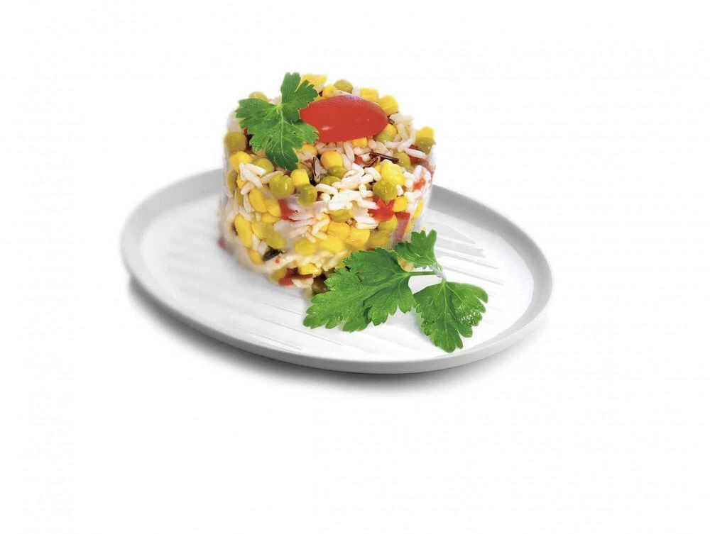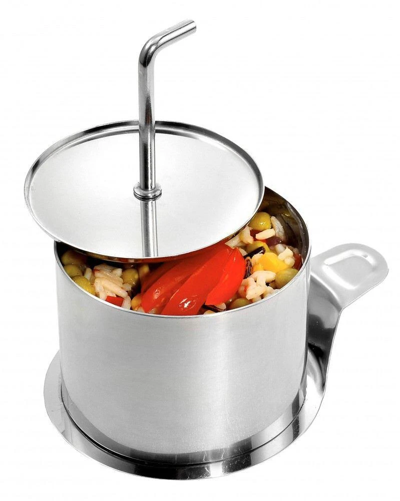 Das 4-teilige Set besteht aus 2 runden Formteilen, einem Stempel und einem Speisenheber.