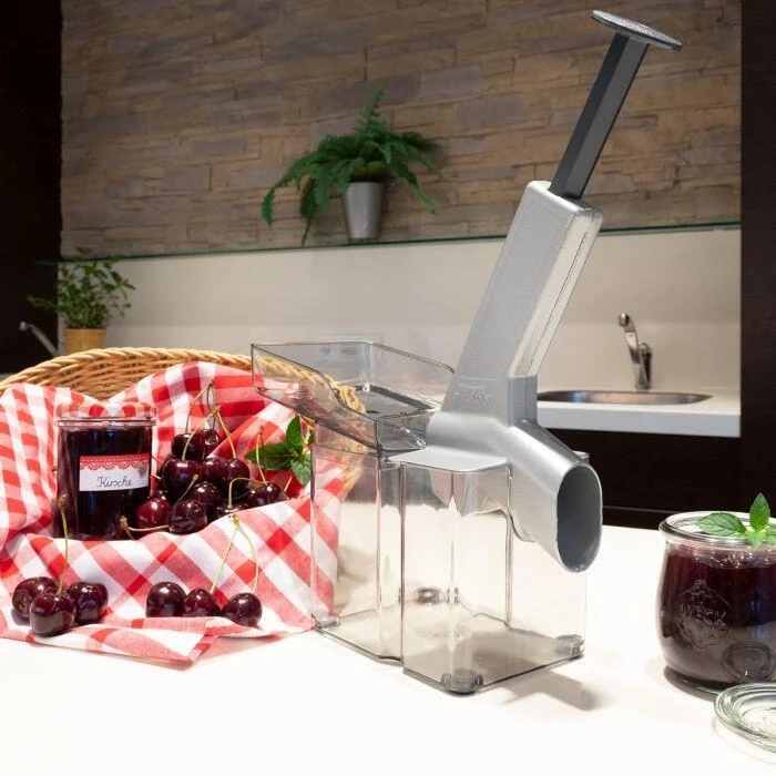 Mit dem Kirschomat geht das Entkernen von Kirschen schnell von der Hand. Auch größere Mengen Früchte können hiermit verarbeitet werden (bis zu 15 kg/h). Dank der schräggestellten Schütte rutschen die Früchte automatisch nach und lassen ein rasches Arbeiten zu. Die große Kernkassette bietet Platz für viele Kerne.